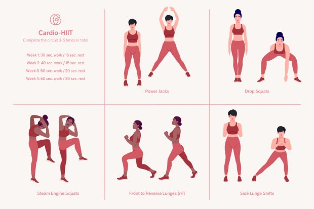 Check out the banner below or keep scrolling for a detailed overview of each exercise in today’s Cardio-HIIT challenge. Let’s get going!