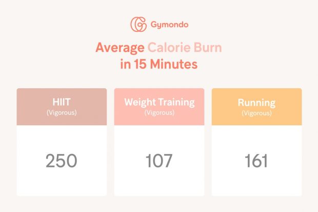 The number of calories you’ll burn depends on a number of factors—your intensity level, body weight, height, genetics, age, etc. You could burn between 150-250 calories from this 15-minute workout.