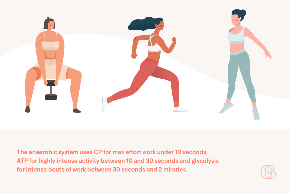 On the other hand, anaerobic activities require short bouts of energy, like lifting heavy weights or sprinting, and don’t require your body to use oxygen. You’ll tire out fast during anaerobic activities because it uses a fast-acting energy pathway called the phosphagen system. The phosphagen system uses creatine phosphate (CP) to generate adenosine triphosphate (ATP), the chemical which provides energy for all body processes.