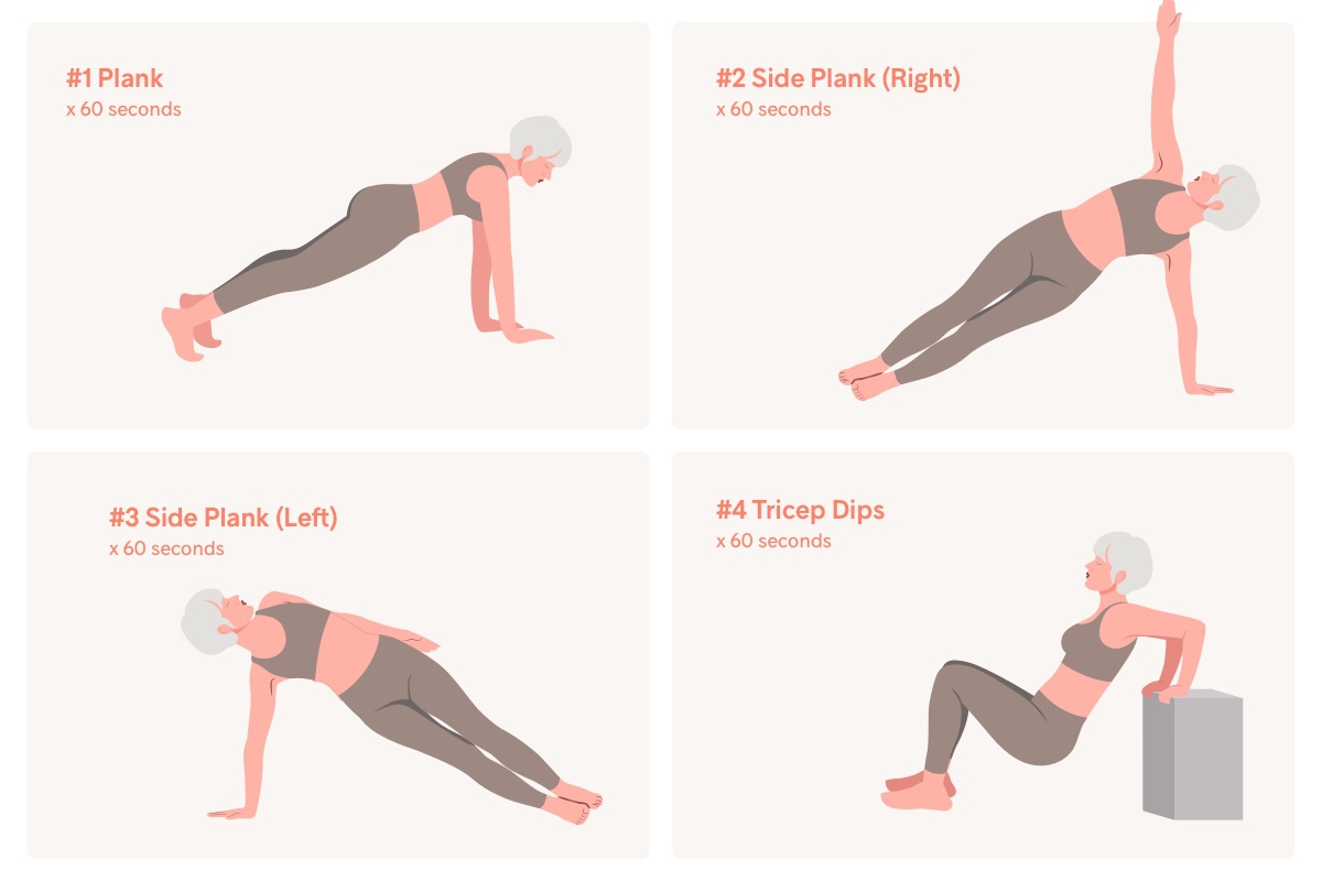 Note: If 60 seconds is too hard, start with 20 to 30 seconds of each exercise and increase the duration each week.