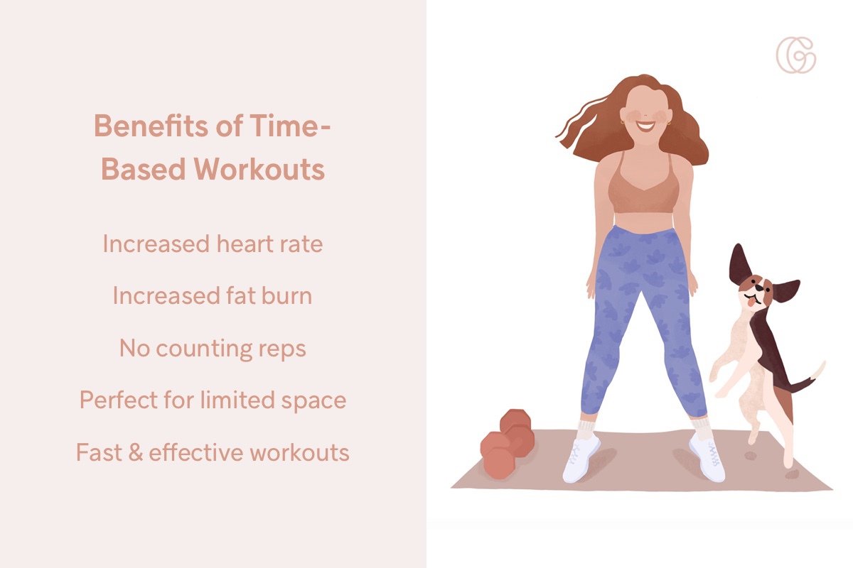 When performing time-based sets, you’re working hard for a specific amount of time followed by short rest breaks throughout the routine. Unlike rep-based workouts, you’ll likely push yourself harder, squeezing in that one extra rep right before time expires. This type of training elevates your heart rate for a targeted time, which results in increased fat burn.
