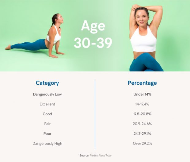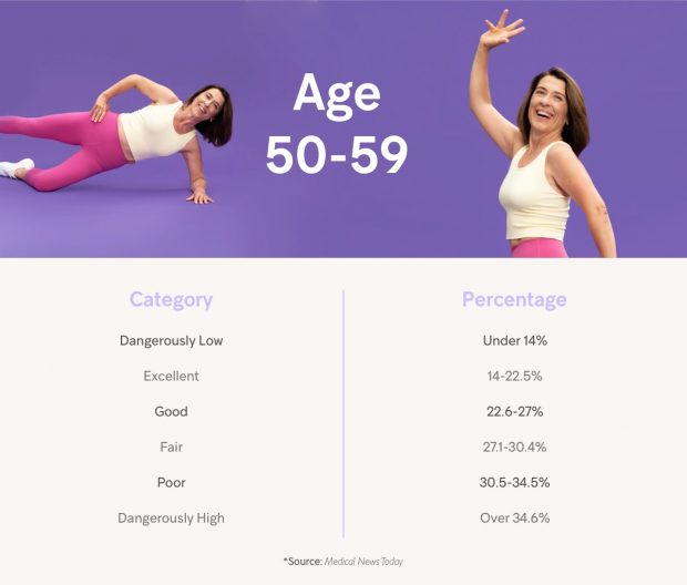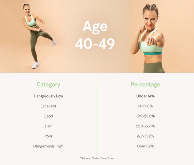 Many things change with age and body fat is no exception. Ideal body fat percentages for women by age group are listed below: