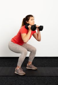 Im Gegensatz zum Back Squat, bei dem sich das Gewicht auf dem Rücken bzw. hinter dem Kopf konzentriert, geschieht die Bewegungsausführung mit den Kurzhanteln auf Schulterhöhe vor dem Körper. Dadurch wird der Körperschwerpunkt verschoben und der Core wird anders beansprucht, als bspw. beim Back Squat.