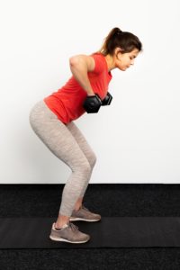 Einatmen bei Entlastung (Hanteln auf Kniehöhe), Ausatmen bei Belastung (Schulterblätter zusammendrücken)