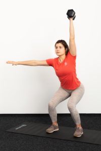 langsam mit Dumbbell über Kopf in tiefen Squat gehen