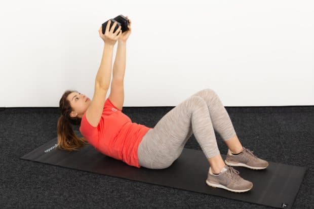 Dumbbell Richtung Decke bringen, nicht Richtung Beine