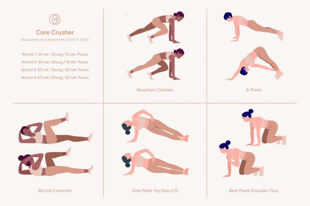 Das heutige Core-Workout beinhaltet viele Plank-Variationen. Der Plank ist einer der Grundpfeiler für eine starke Rumpfmuskulatur – er ist relativ einfach zu lernen, es gibt viele Variationen und du wirst dich so schnell nicht langweiligen.