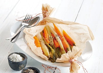 Bei der Zubereitung “en papilotte” garen die Zutaten in ihrem eigenen Saft. Dieses Rezept holt aus den weißen Spargelstangen und den jungen Karotten alles heraus.