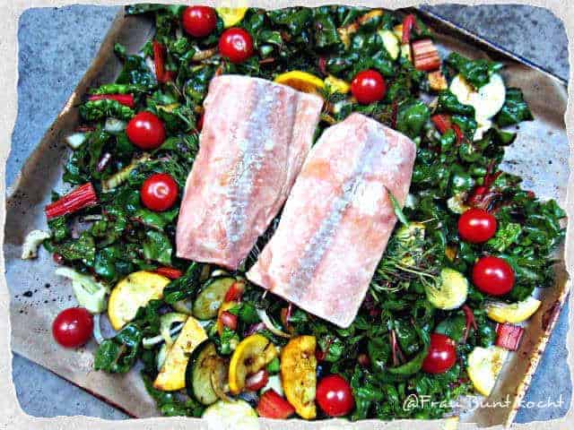 Ein simples Rezept, bei dem die Hauptzutat Kreativität heißt. Die unten angegeben Zutaten sind lediglich Beispiele! Nutze, was im Haus bzw. im Garten zu finden ist. Je mehr verschiedene Gemüsesorten Du benutzt, desto mehr verschiedene Nährstoffe hast Du am Ende auf dem Teller. Der Lachs versorgt Dich zusätzlich mit gesunden Fetten, die dem Körper dabei helfen, die Vitamine des Gemüses aufzunehmen. Heimische oder exotische Gewürze geben Deiner Kreation eine persönliche Note! Probieren geht über Studieren: Hier kann jeder seinen persönlichen Lieblingsmix erfinden.