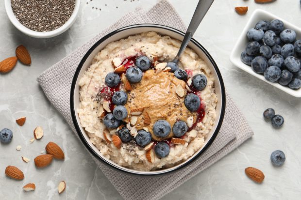 Frühstück: Haferflocken mit Beeren und Nussbutter (Erdnuss, Mandel, Cashew)