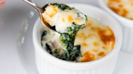 Zutaten für 1 Portion250 g Spinat (roh)1/2 Zwiebel1 EL Olivenöl15 g Parmesankäse (gehobelt)nach Belieben Salz & Pfeffer1 Prise Muskatnuss (gemahlen)1 EL Saure Sahne2 Eier75 g Käse (gerieben, fettarm)