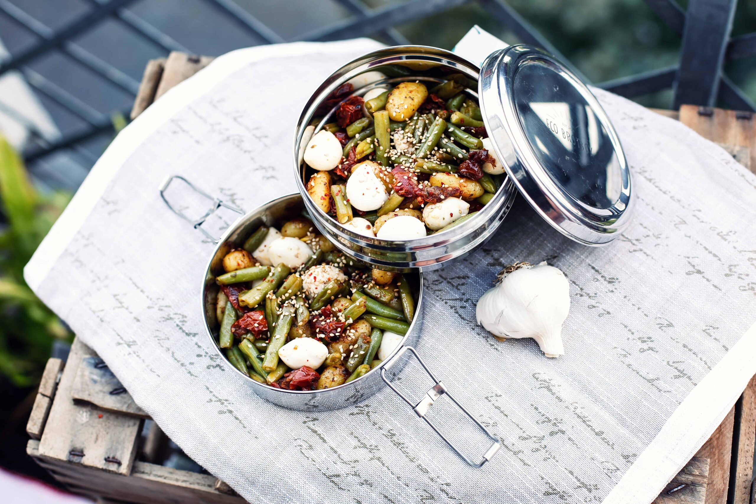 Gnocchi in Tomatenöl mit Knoblauch angebraten – ein super einfaches und leckeres Rezept für die Mittagspause! Besorge dir eine schöne Dose, die du routinemäßig für deine vor- und zubereiteten Speisen für den nächsten Tag füllst.