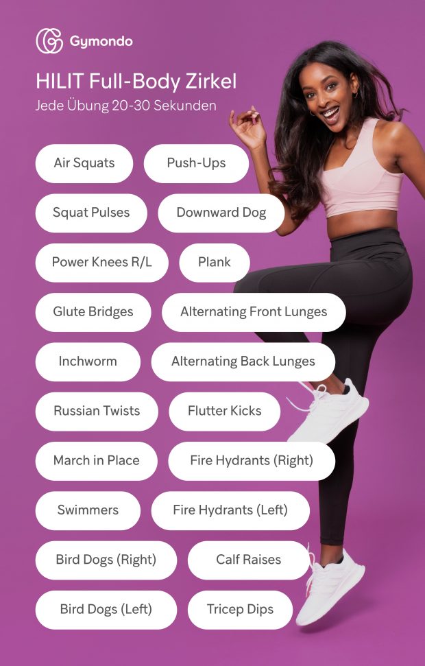 Klingt gut? Dann versuch dich doch gleich an diesem HILIT-Zirkel! Anfänger*innen können mit Intervalllängen von 20 Sekunden starten. Fortgeschrittene können die Intervalldauer auf 60 Sekunden erhöhen. Suchst du den maximalen Kick, kannst du die Länge jeder Übung auf bis zu 120 Sekunden anziehen. Variiere die Dynamik der Cardio-Intervalle oder intensiviere Squats oder Bird Dogs mit zusätzlichem Hantelgewicht.