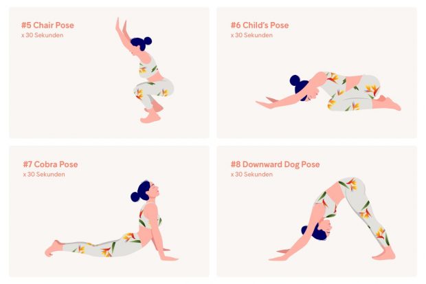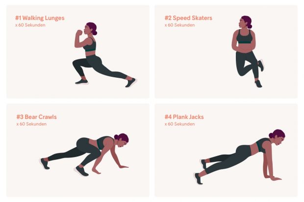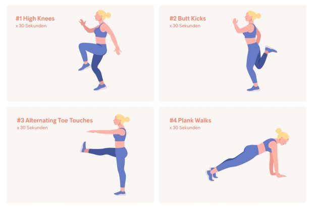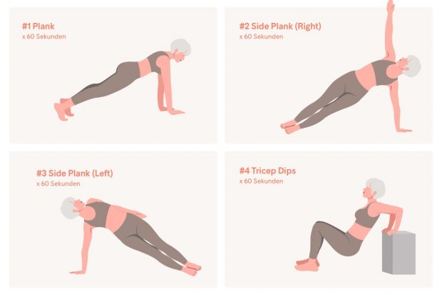 Tipp: Wenn 60 Sekunden dir zu schwer sind, dann beginne mit 20-30 Sekunden pro Übung und versuche, dich wöchentlich zu steigern.