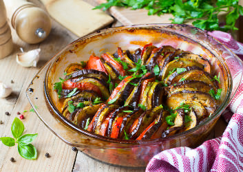 In den Schalen von Zucchini, Paprika, Aubergine und Flaschenkürbis stecken besonders viele Mineralstoffe, die man beim Garen im Ofen dranlassen sollte. Kauf daher lieber Bio-Gemüse, dessen Schale nicht mit Pestiziden behandelt wurde. Grüne Paprikaschoten enthalten viel Vitamin C. Tomaten sind reich an Vitamin A und C, Carotinen und Carotinoiden. Zucchini enthält einen hohen Ballaststoffanteil, aber auch Vitamin A und Kalium. Süßkartoffeln sind sehr gesund, denn sie enthalten Vitamin A, C und B, Mangan, Kalium und Beta-Carotin. Ihr leicht süß-mehliger Geschmack passt gut zur herben Säure der anderen Gemüse. Frische Kräuter fördern die Verdauung und verleihen dem Gemüse durch ihre ätherischen Öle ein würziges Aroma.