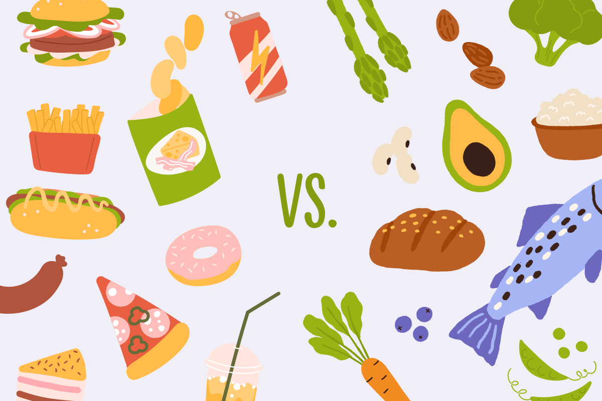 Fokussiere dich bei der Wahl deiner Lebensmittel auf unverarbeitetes und natürliches wie frischen Fisch, mageres Fleisch, Tofu, Hülsenfrüchte, Obst, Gemüse, Nüsse und Vollkornprodukte. So kannst du sichergehen, dass du ausreichend gesunde Nährstoffe, Vitamine und Mineralstoffe zu dir nimmst.