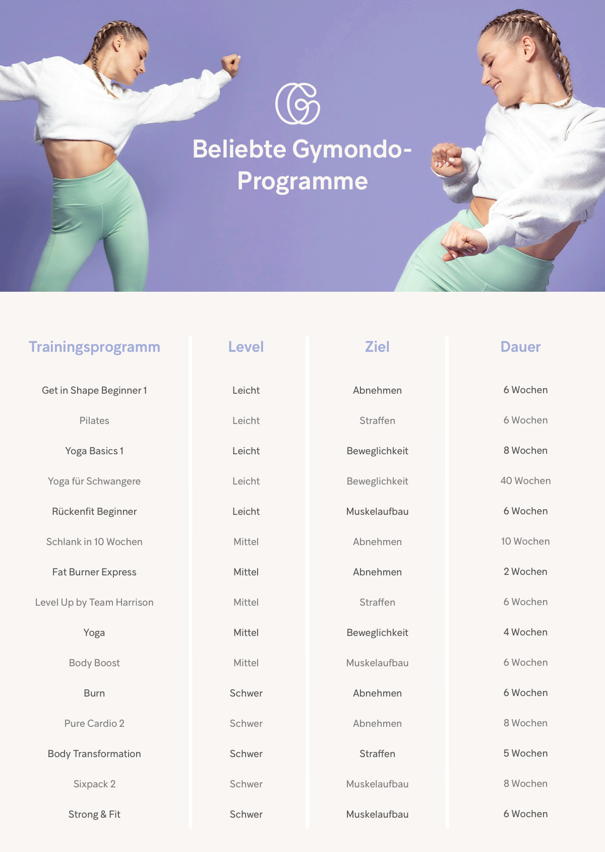 Hier findest du eine beispielhafte Übersicht einiger beliebter Trainingsprogramme und ihrer Charakteristika. Unsere Programme entscheiden sich neben der Kategorie (z.B. Yoga, HIIT oder Dance) in Level, Ziel und Dauer. Du kannst bei Gymondo mittlerweile aus über 80 Trainingsprogrammen wählen, hier ein Auszug einiger beliebter Programme (anklicken zum Vergrößern):