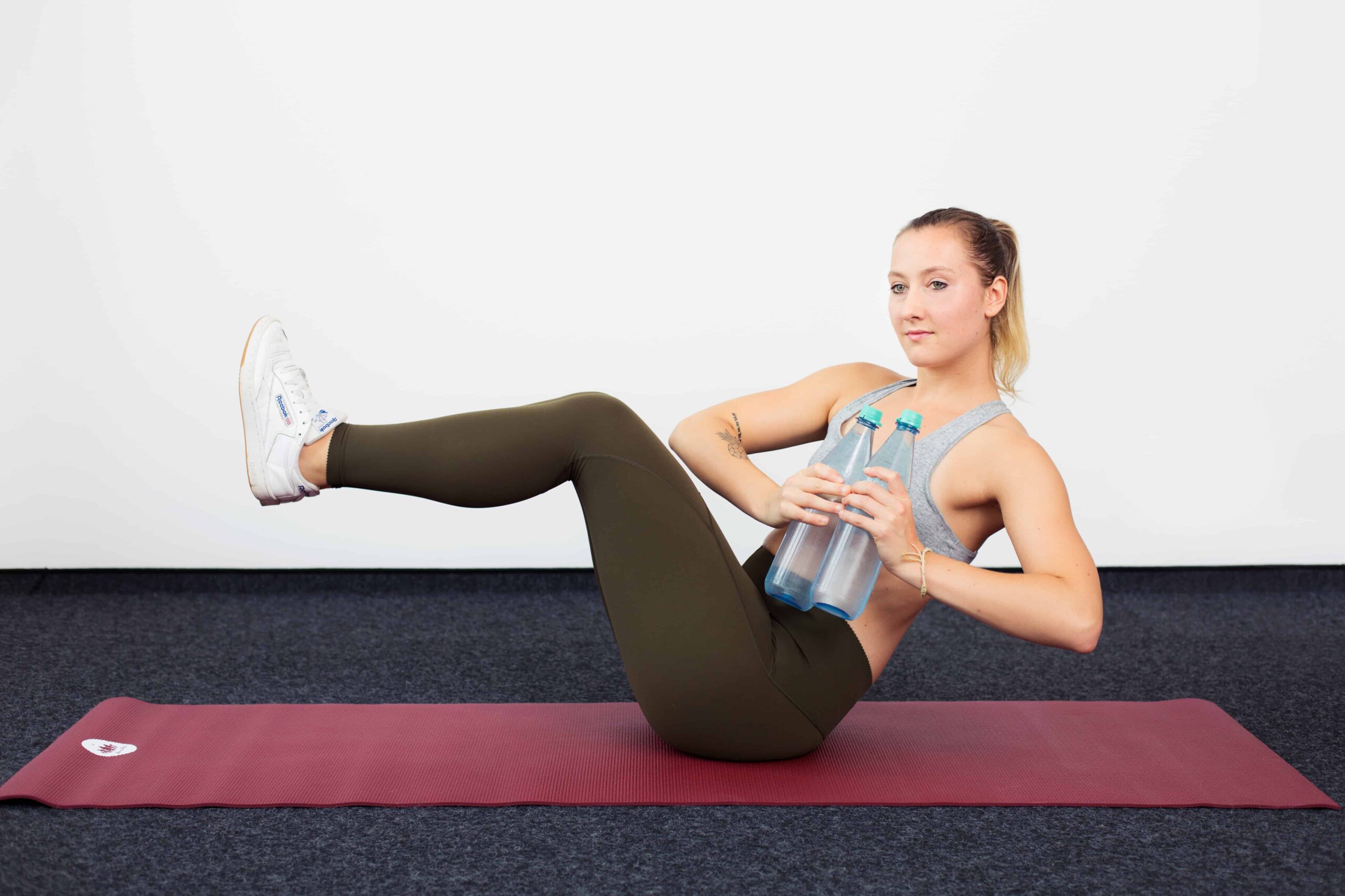 Setz dich dazu einfach auf deine Matte und hebe deine Beine vom Boden ab. Mit beiden Händen und mit angewinkelten Ellenbogen hältst Du die Wasserflaschen vor Deinem Körper in der Luft. Rotiere den gesamten Oberkörper von rechts nach links. Eine Minute Powertraining für die schlanke Taille!